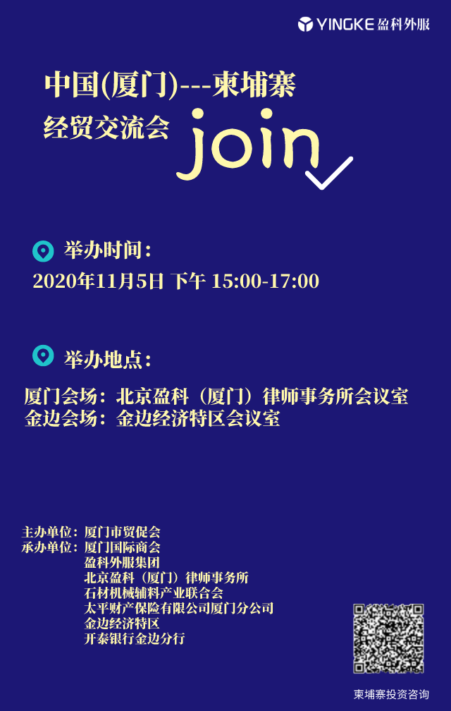 在中柬两国经贸合作开启新篇章之际,盈科外服集团联合盈科律师事务所等多家机构在福建省厦门市举办-柬埔寨贸易交流会,向厦门市有关企业宣导中柬自贸协定主要内容,解析协定释放的商机信息。同时我们也会邀请柬埔寨经贸主管部门及相关机构介绍柬埔寨经商环境,增进厦门企业对柬埔寨的了解,推动双边企业和产业合作。会议能容丰富多彩,欢迎各大企业踊跃参与。